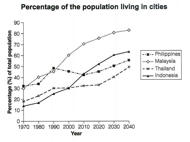 The graph below gives information about the percentage of the population in four Asian countries living in cities from 1970 to 2020, with predictions for 2030 and 2040. Summarise the information by selecting and reporting the main features, and make comparisons where relevant.